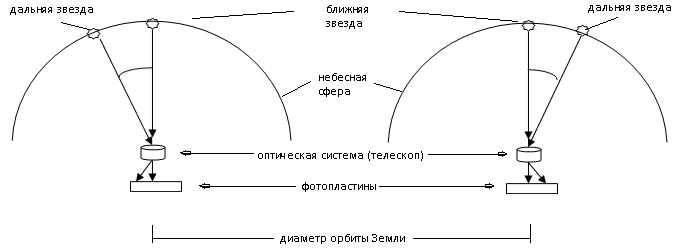 Мы можем измерить это смещение! Линейное расстояние на фотопластинке между засвеченными пятнышками через оптические параметры телескопа можно пересчитать в угловое расстояние между звездами на небесной сфере.