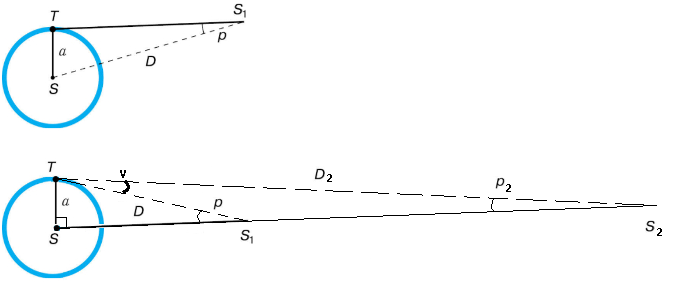 И это, два угла через полгода – все, что у нас есть. У нас есть (хорошо обоснованное) предположение, что «неподвижная» звезда расположена дальше, чем «подвижная», у нас есть два измеренных угла между ними, и у нас есть диаметр земной орбиты.
