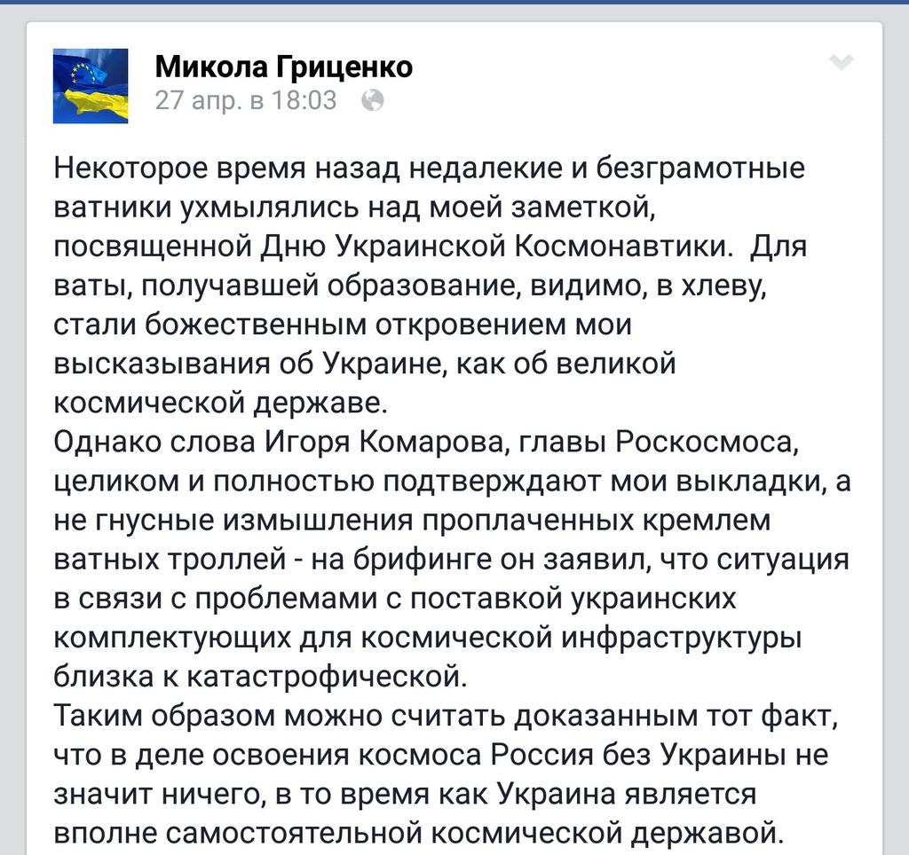 «Они заинтересованы, потому что сами пока делать их не могут, а если смогут, то на это потребуется 5-10 лет. Конечно, им выгоднее у нас покупать. <...> Документация была им передана. Сначала они говорили, что создадут по нашей документации двигатель в течение двух-трёх лет. В НПО «Энергомаш» сказали, что минимум 10 лет им понадобится, и оказались правы», — сообщил эксперт в интервью RT.