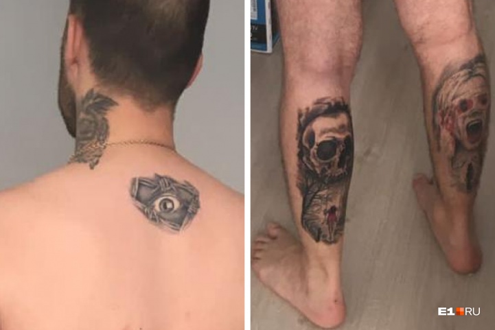 шее — филин (слева), между лопаток изображен глаз, на левой икре — череп, на правой — портрет кричащей женщины.